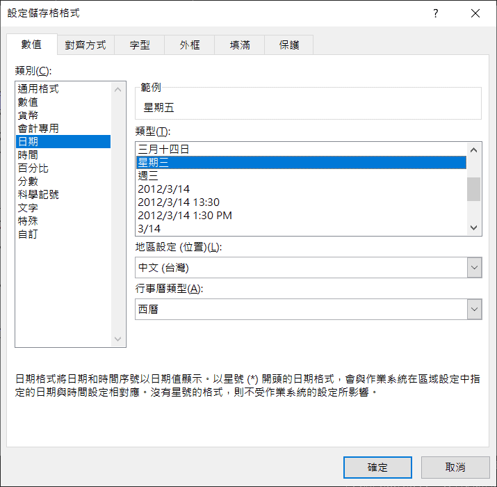 由於我想單純以「日一二三四五六」來表示,所以這邊就動用了函數來達成我要的目的