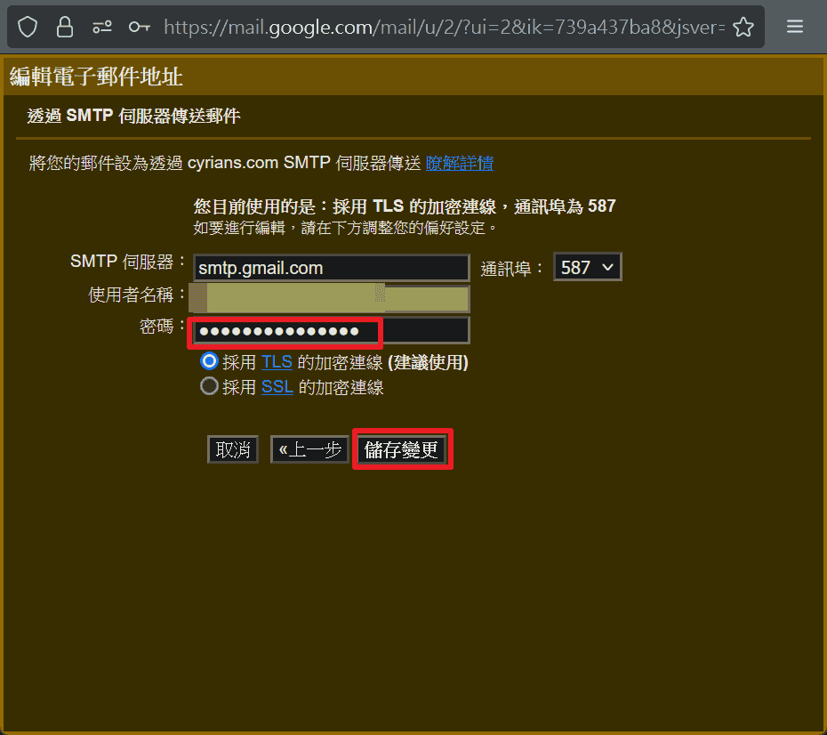由於使用的是Gmail寄信,所以這邊是用Gmail原本設定(包含使用者名稱也都是要用Gmail的使用者名稱),但是這裡的密碼是稍早出現的「應用程式密碼」,這裡要填入剛剛的記錄下來的「應用程式密碼」