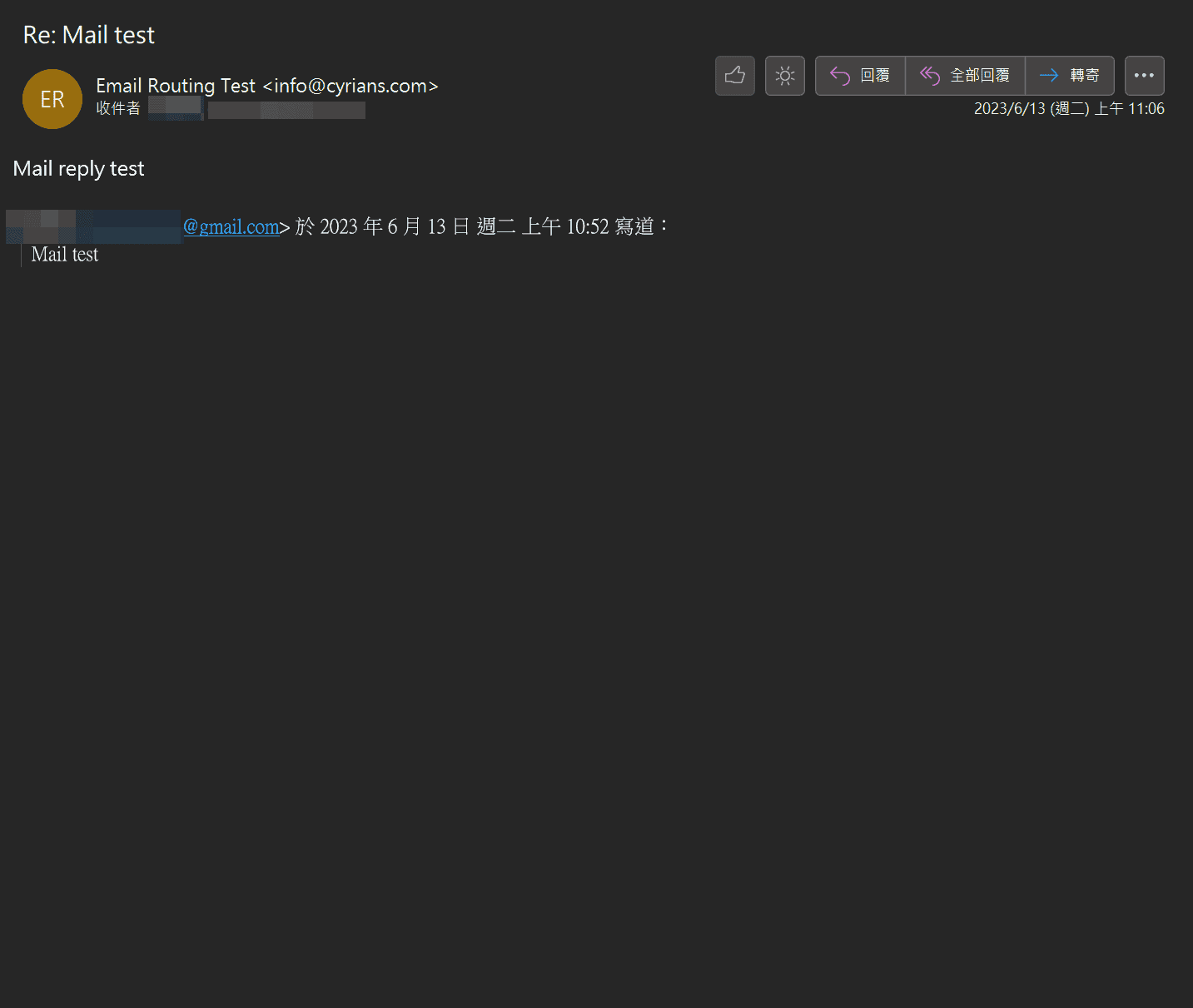 你問我有可能被當作垃圾郵件有解嗎?就目前的答案來講是沒有,因為Cloudflare在這裡就只是個跳板,和你的MX記錄、TXT記錄都不符合,自然有很大機率被當作垃圾郵件,之後會不會有所改善?或許有,但也或許那時候Cloudflare也要收費也不一定,不管怎麼說,還是按照正規路線,自己架個郵件伺服器或是申請付費主機來託管你的郵件(且可以使用你購買的域名),這樣就可以降低被丟入垃圾信件堆的機率