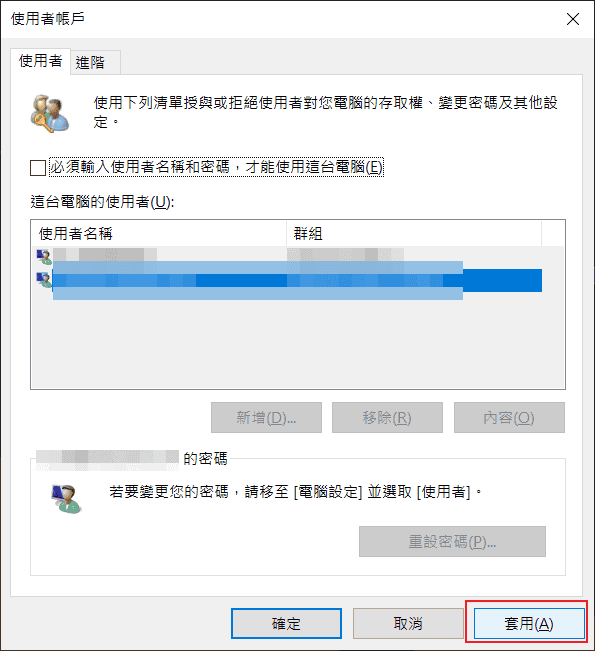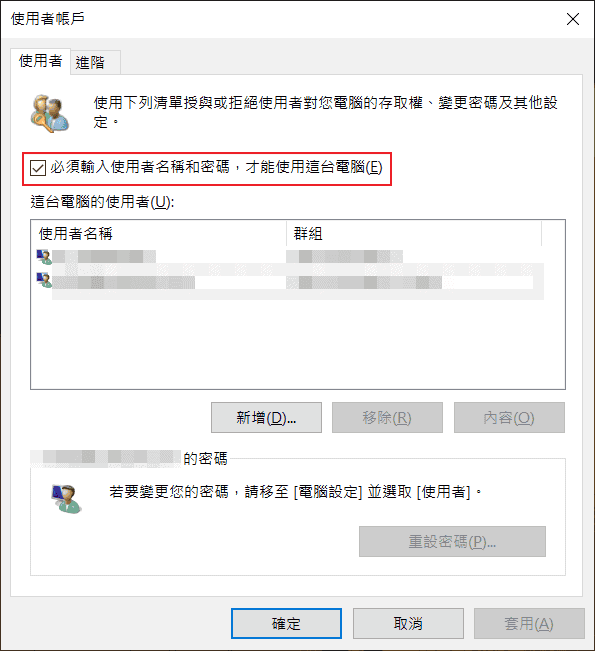 把「必須輸入使用者名稱和密碼,才能使用這台電腦」的選項去掉打勾